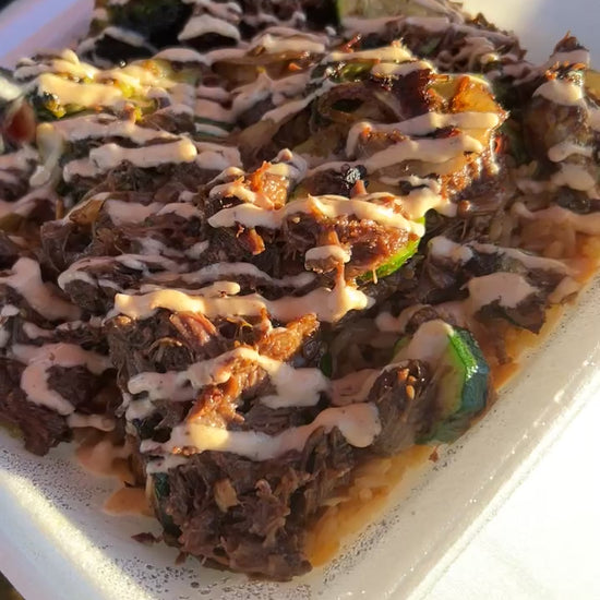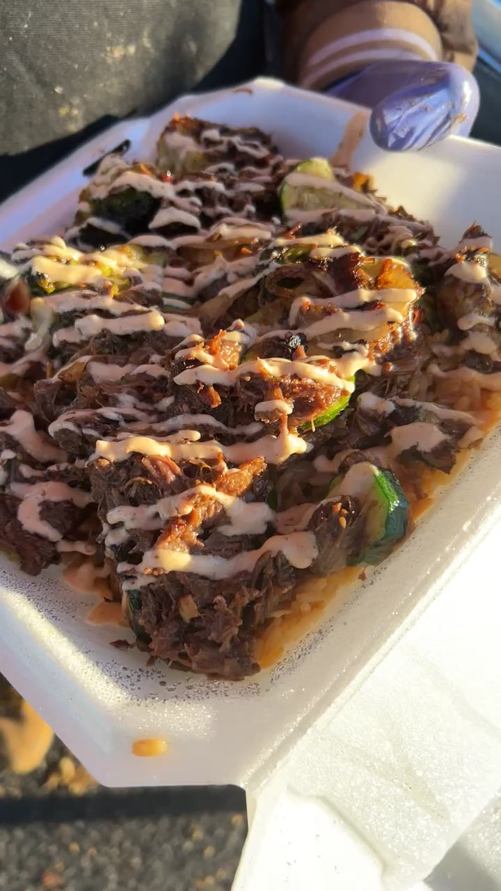 Fried rice, shredded oxtail meat, chefs sauce, veggies